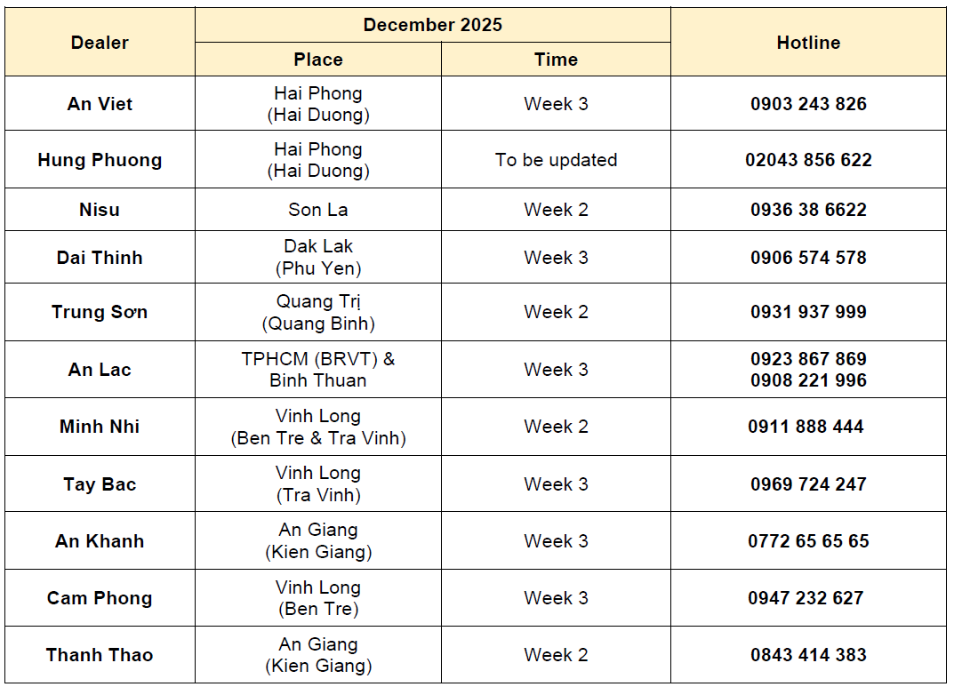 To thank Customers for trusting and using our products, with the desire to accompany and take care of the vehicles to operate in perfect condition, ISUZU Vietnam would like to inform Customers of the schedule of Mobile Service events in December 2025.