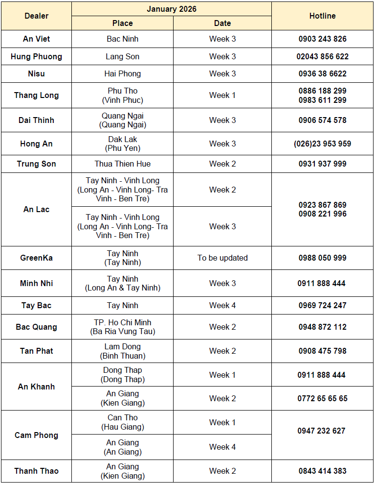 To thank Customers for trusting and using our products, with the desire to accompany and take care of the vehicles to operate in perfect condition, ISUZU Vietnam would like to inform Customers of the schedule of Mobile Service events in January 2026.