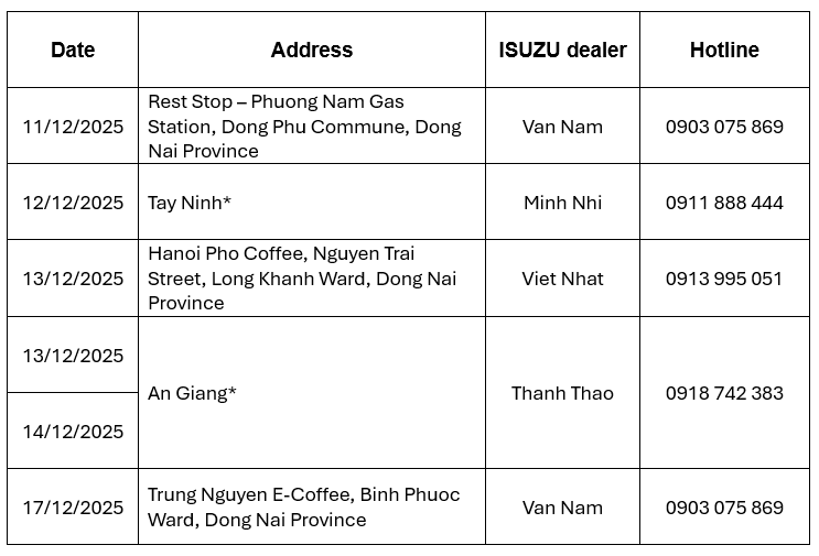 Additionally, customers can stay updated with the latest information about ISUZU Vehicle Display & Test Drive event on the official website of the ISUZU Vietnam Dealer network as listed below: