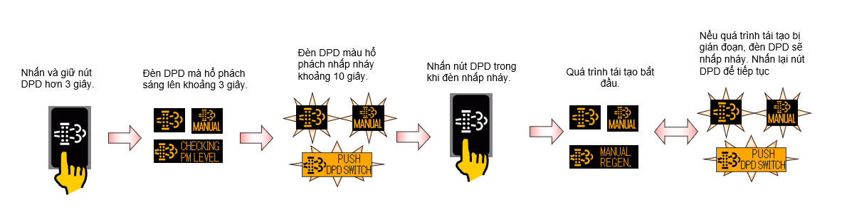 Khi quá trình tái tạo tự động bị gián đoạn, đèn cản báo DPD màu hổ phách sẽ xuất hiện và nhấp nháy. Lái xe cần thực hiện tái tạo thủ công.