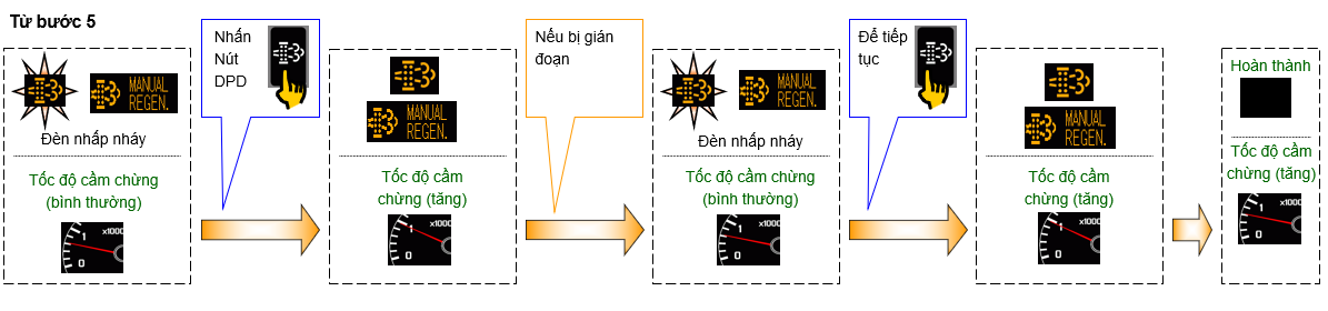 - Đèn báo tái tạo thủ công DPD (màu hổ phách) sẽ ngừng nhấp nháy rồi sáng liên tục, đồng thời tốc độ động cơ sẽ tự động tăng lên và bắt đầu tái tạo.